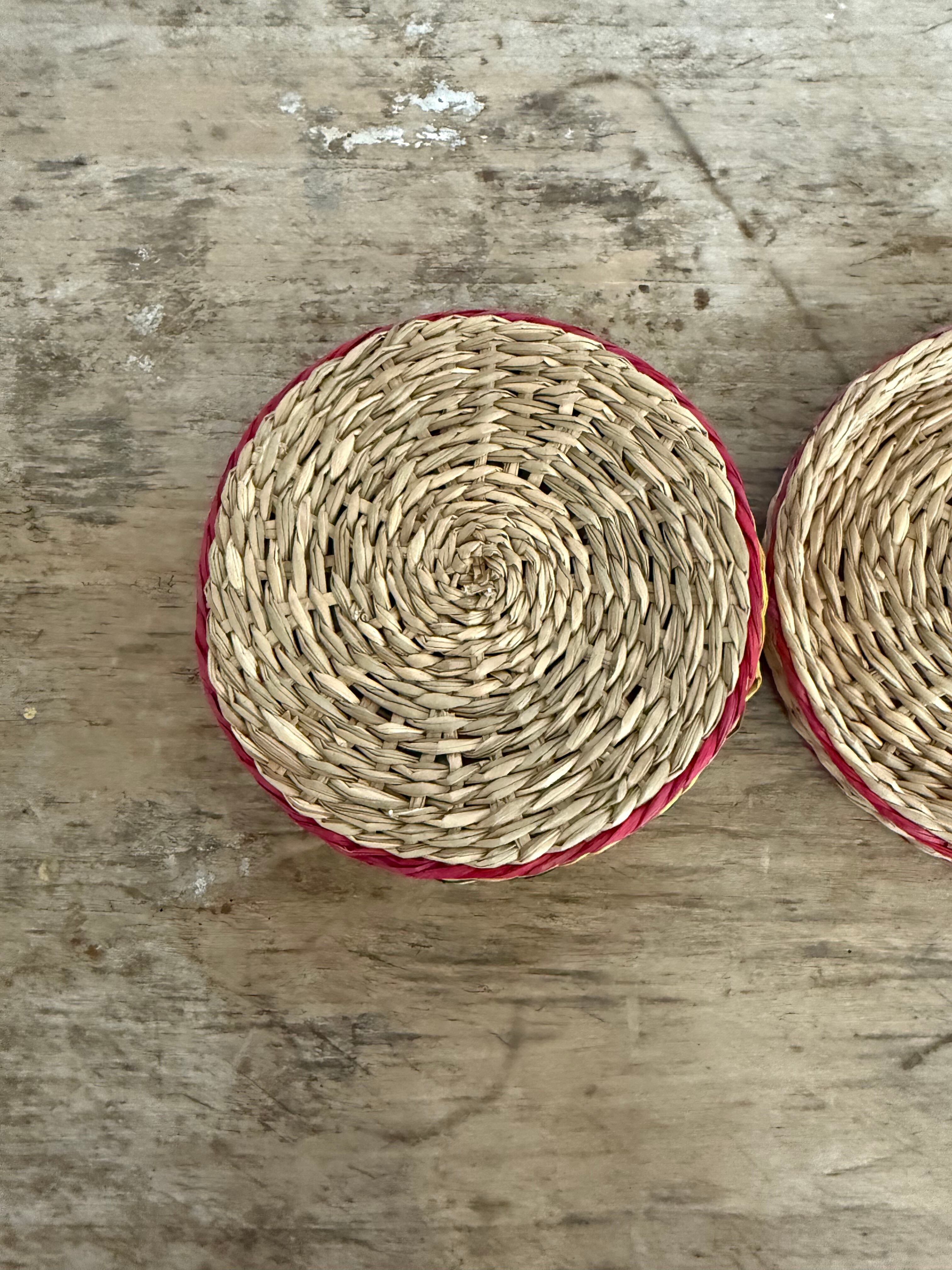 ワンゴルというい草のような自然素材に、赤・緑・黄・黒のビニール紐を編み込んだ、当時ならではの色使いが印象的