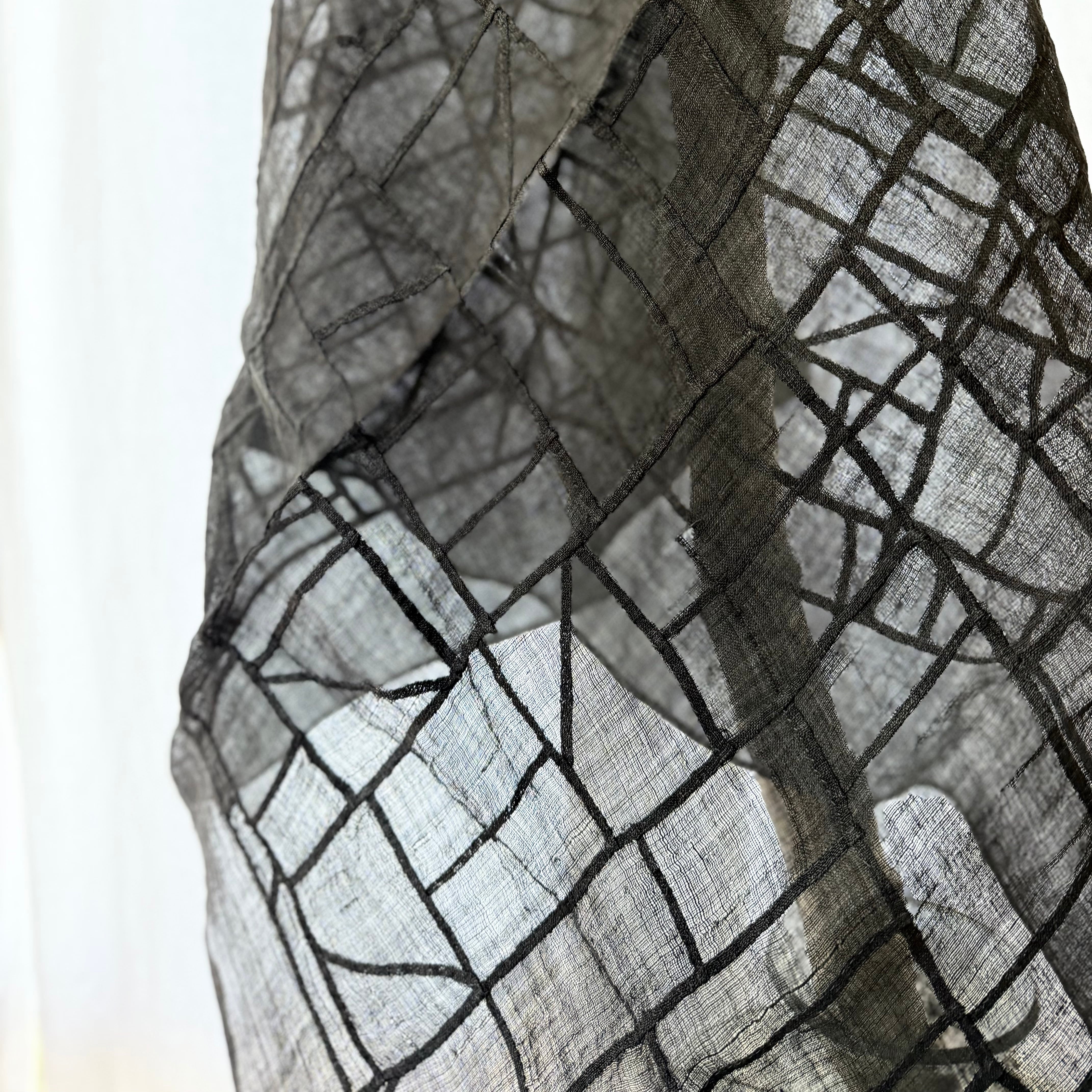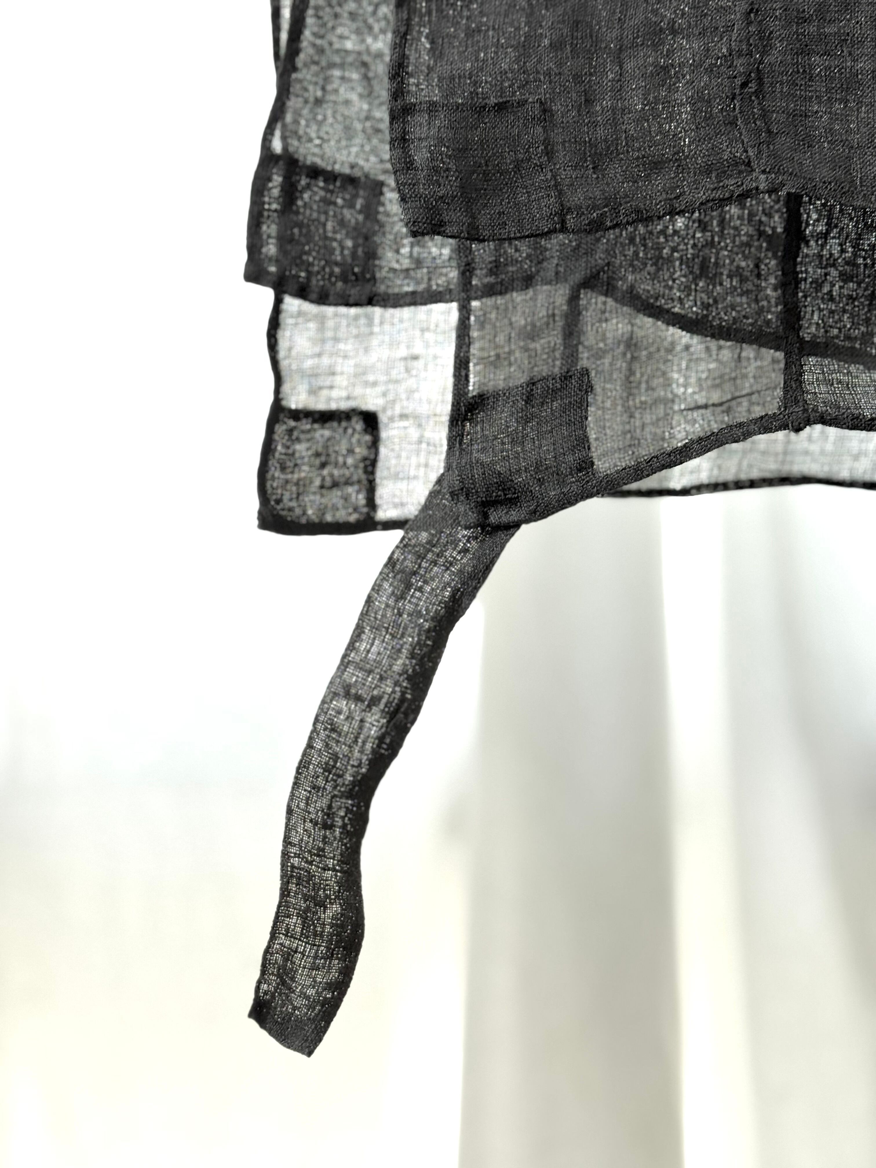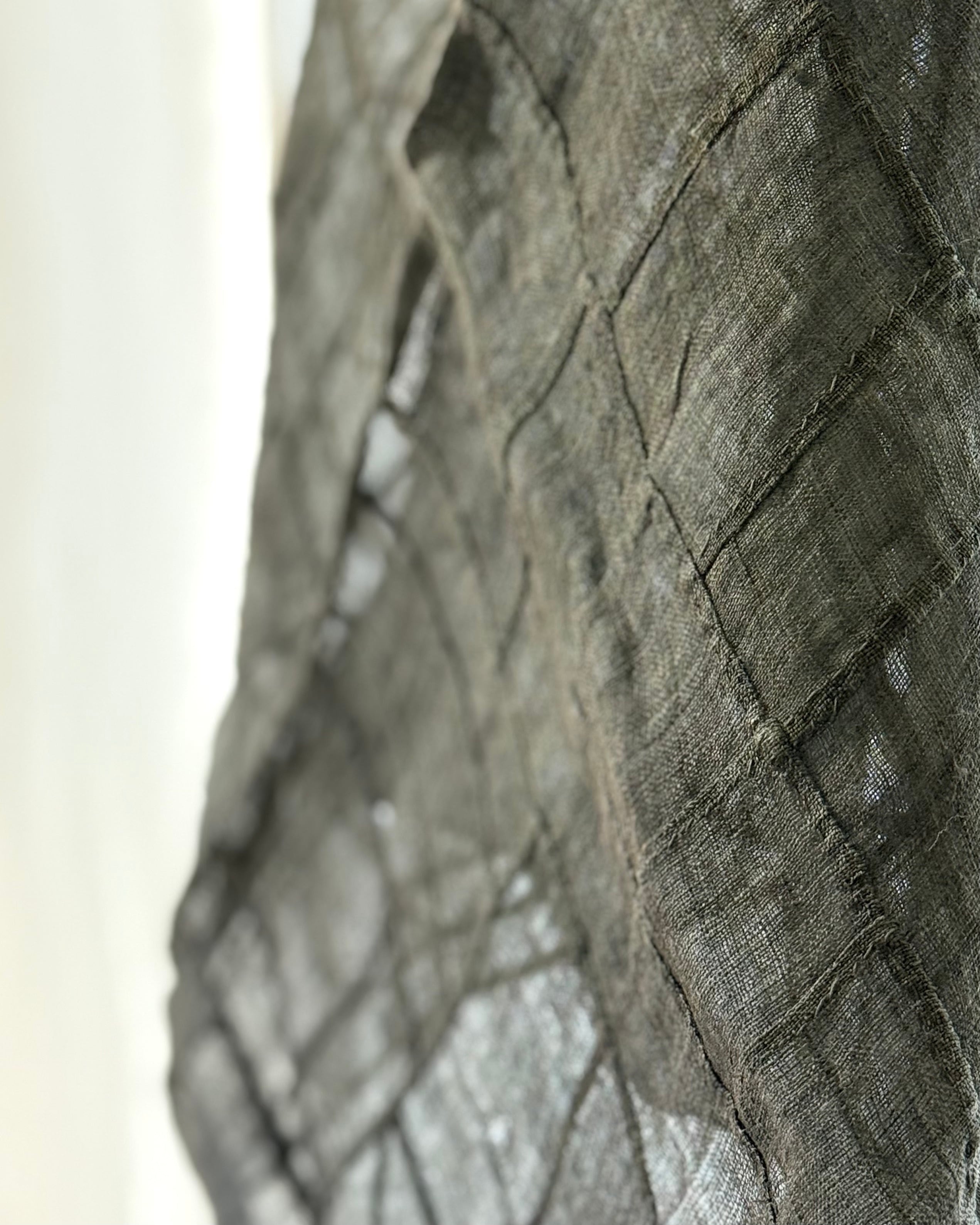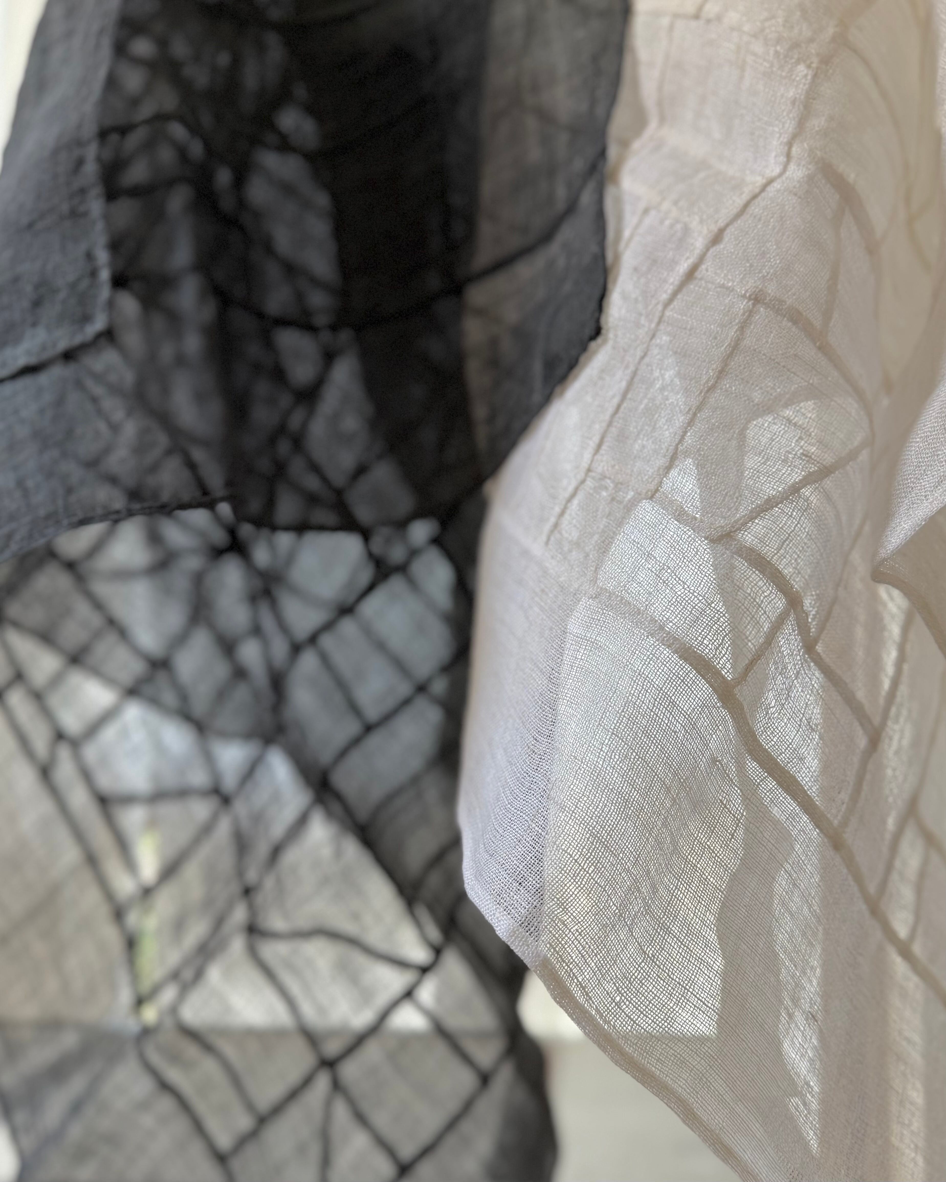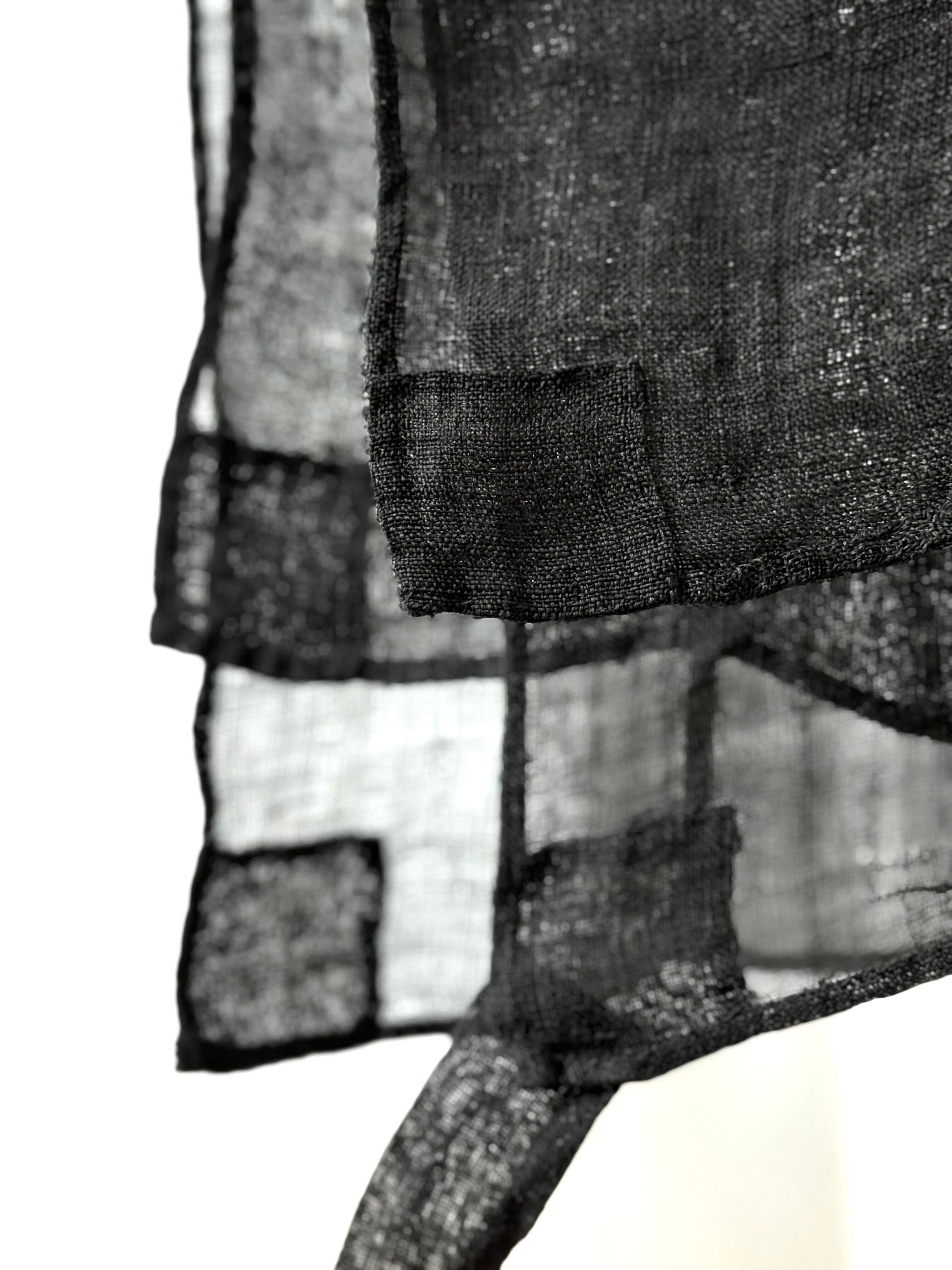 深い黒のトーンが布の縫い目や重なりを際立たせ、