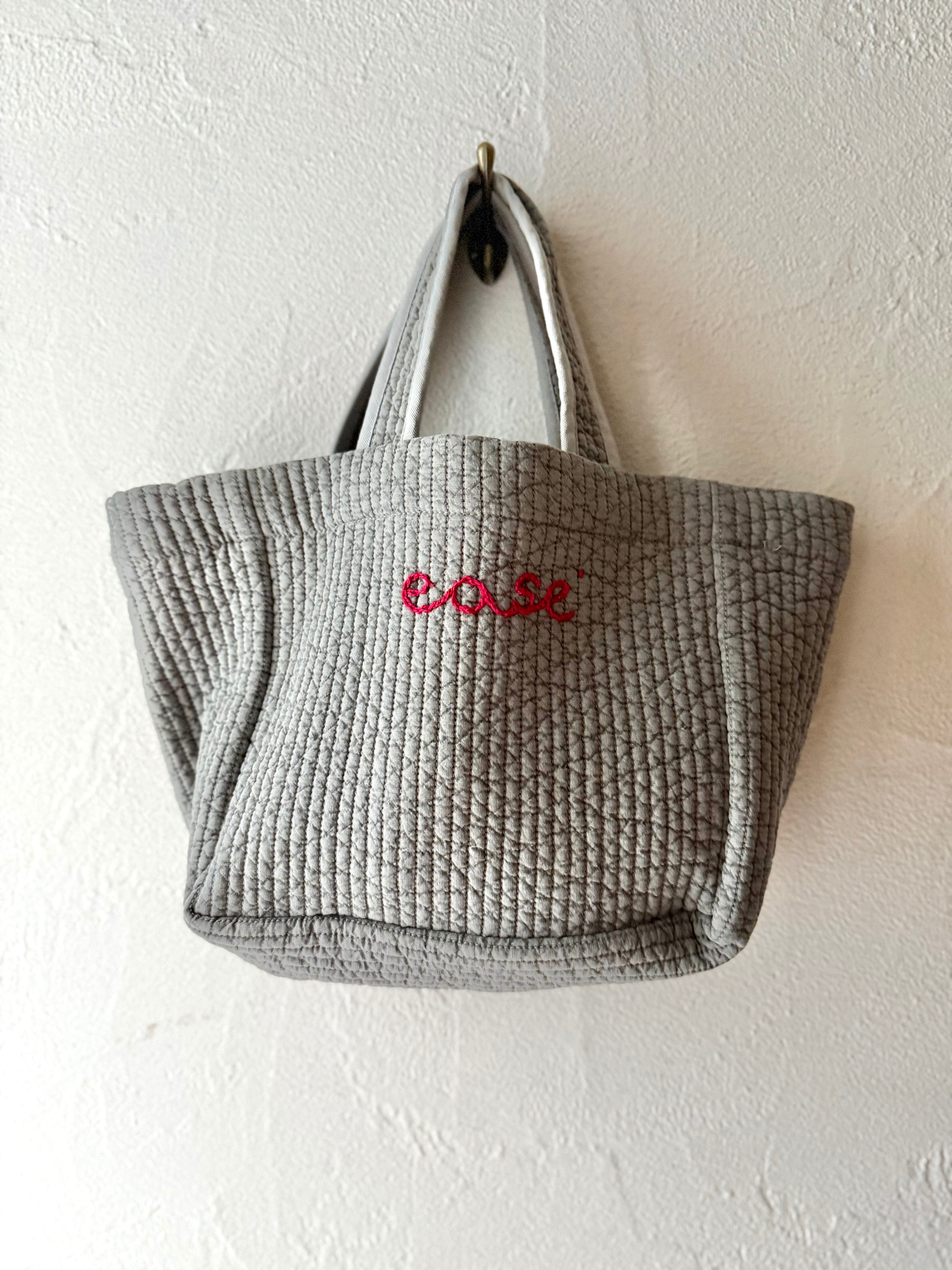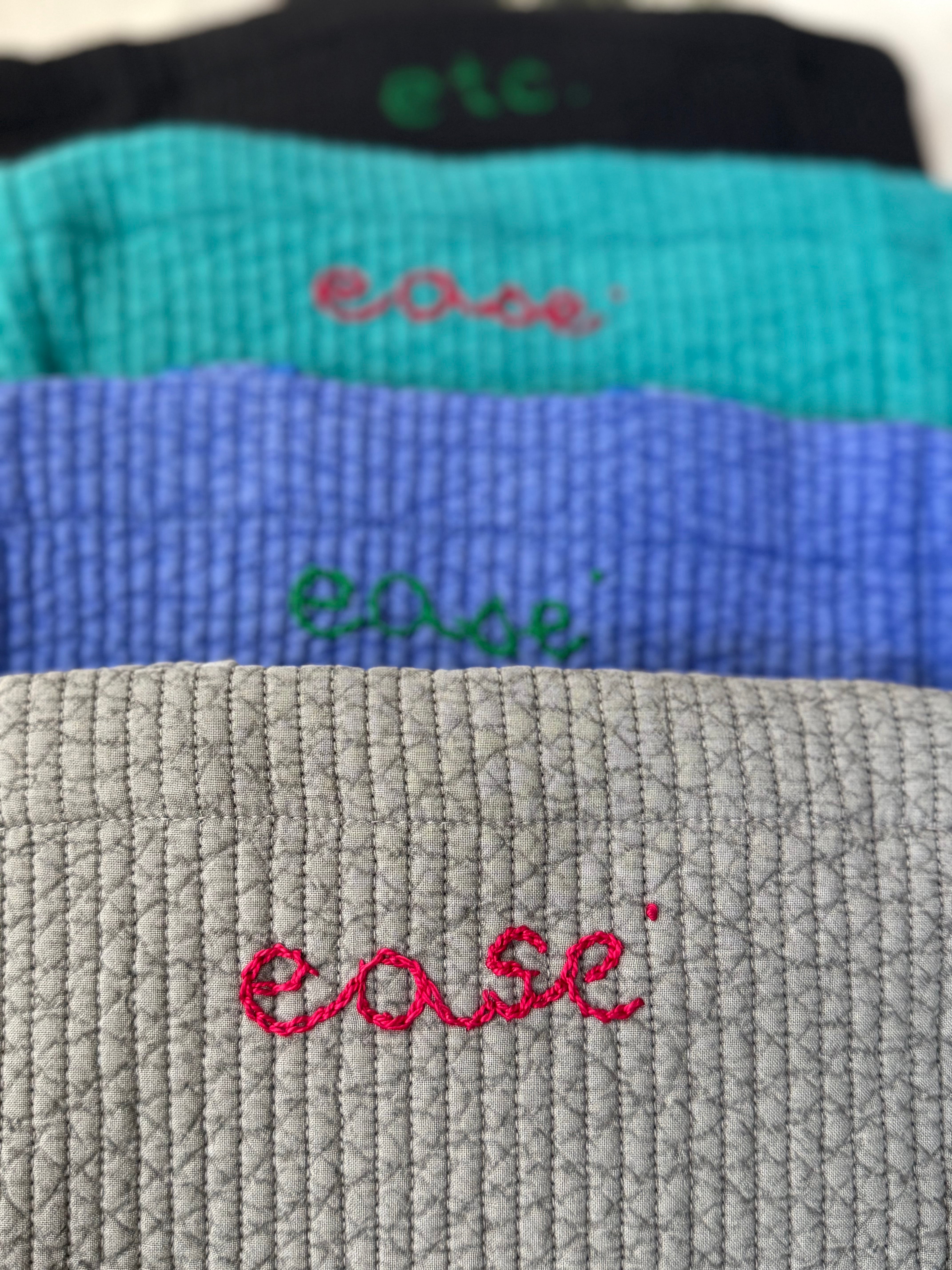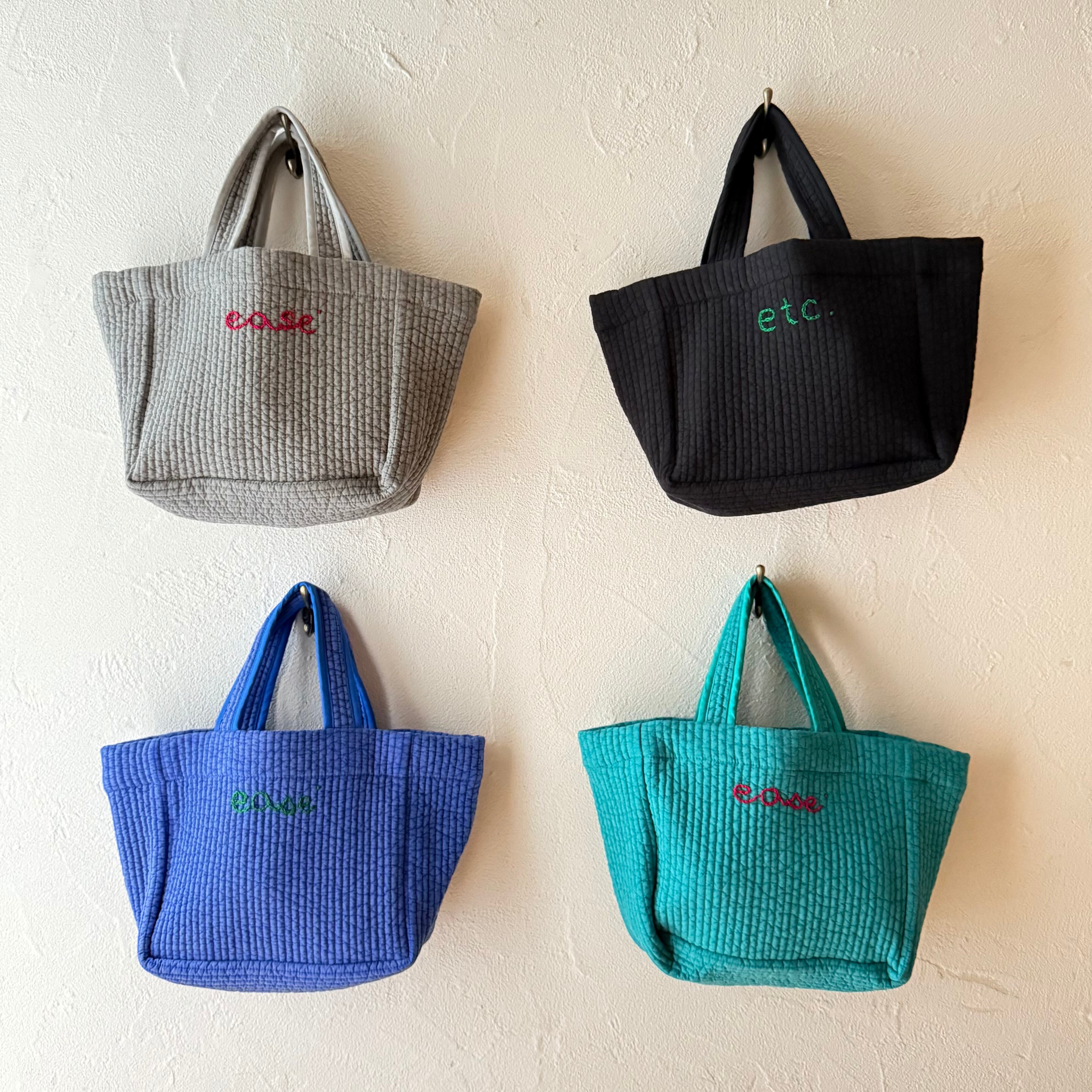 *グレー, ターコイズブルーのバッグは赤で ”ease"