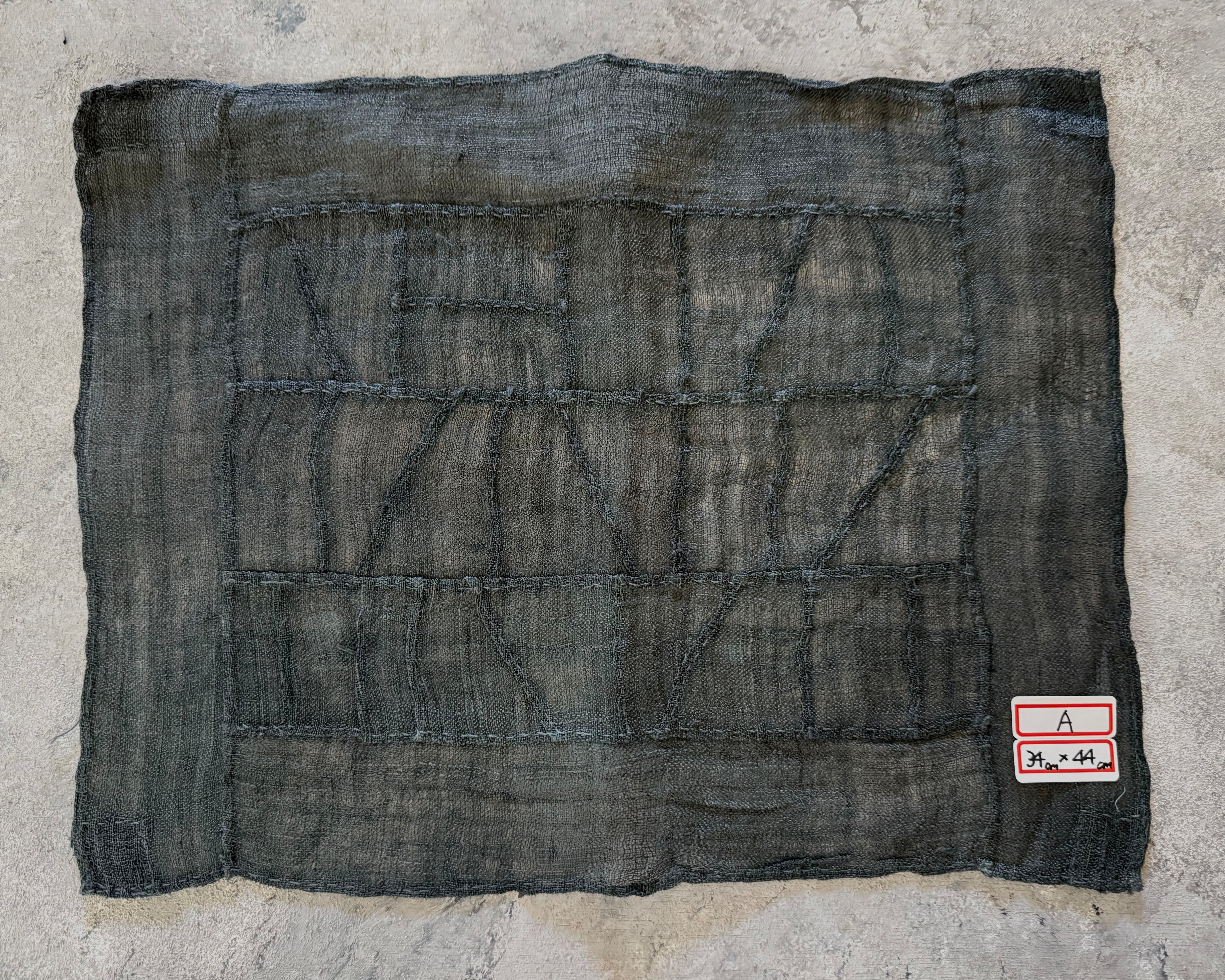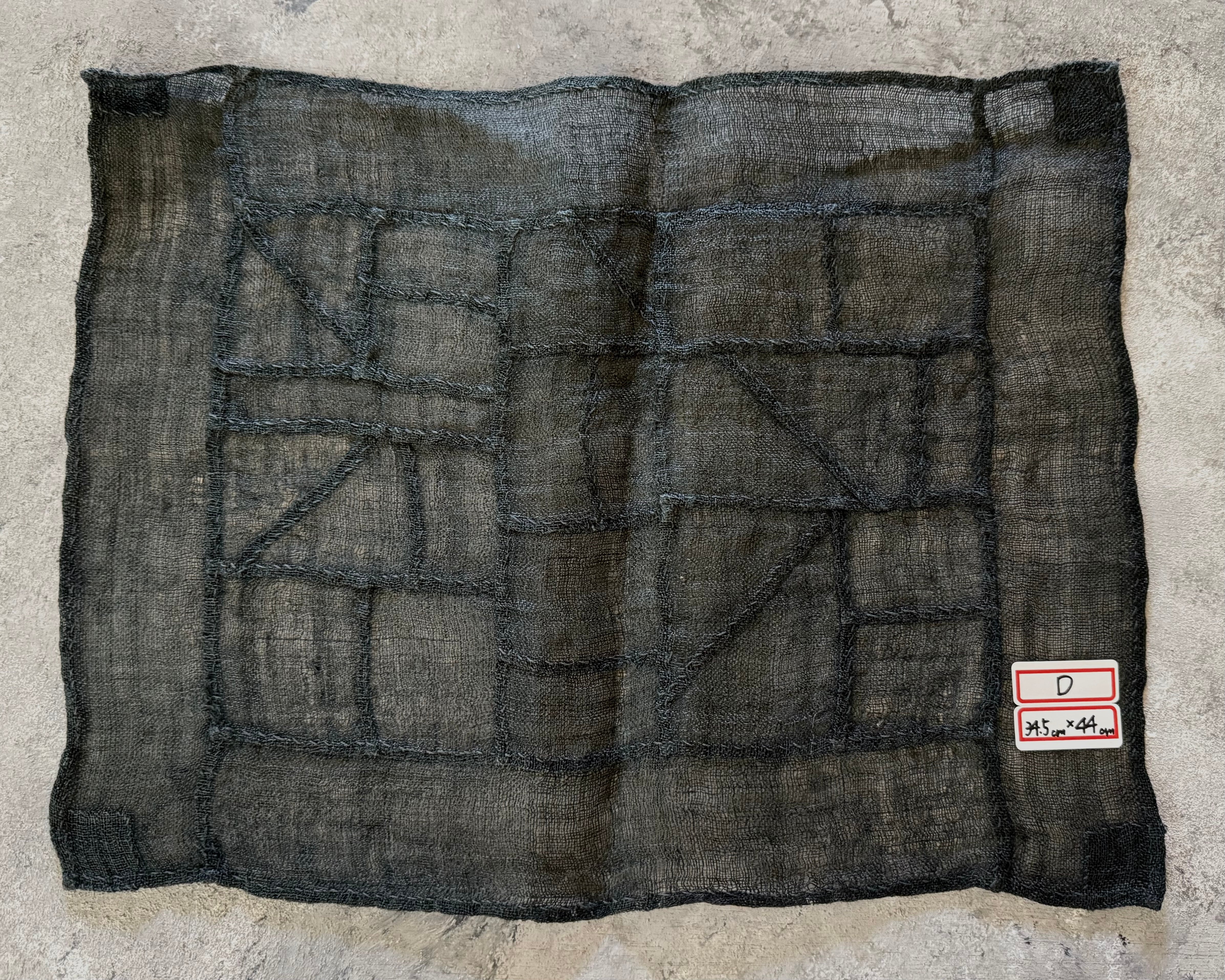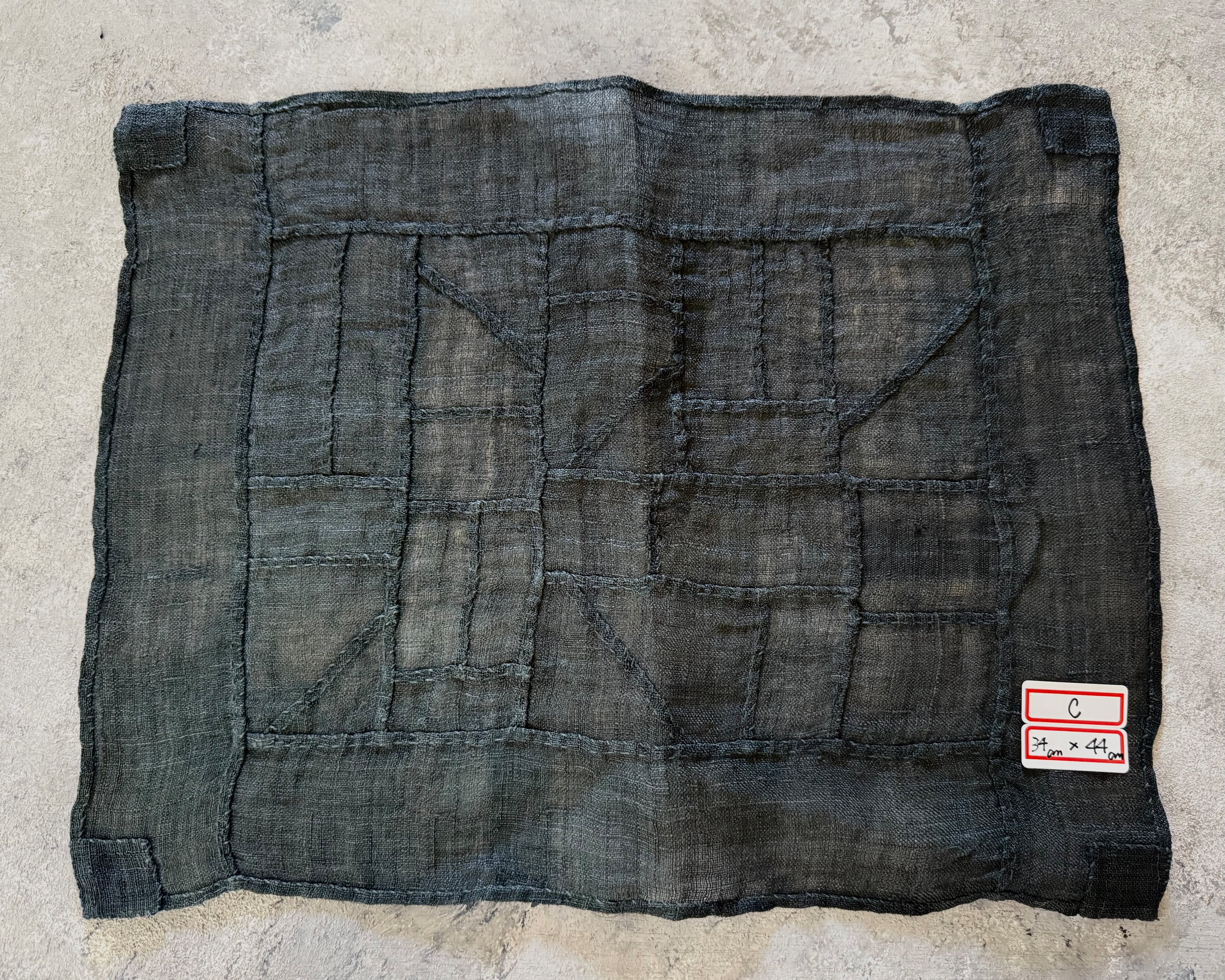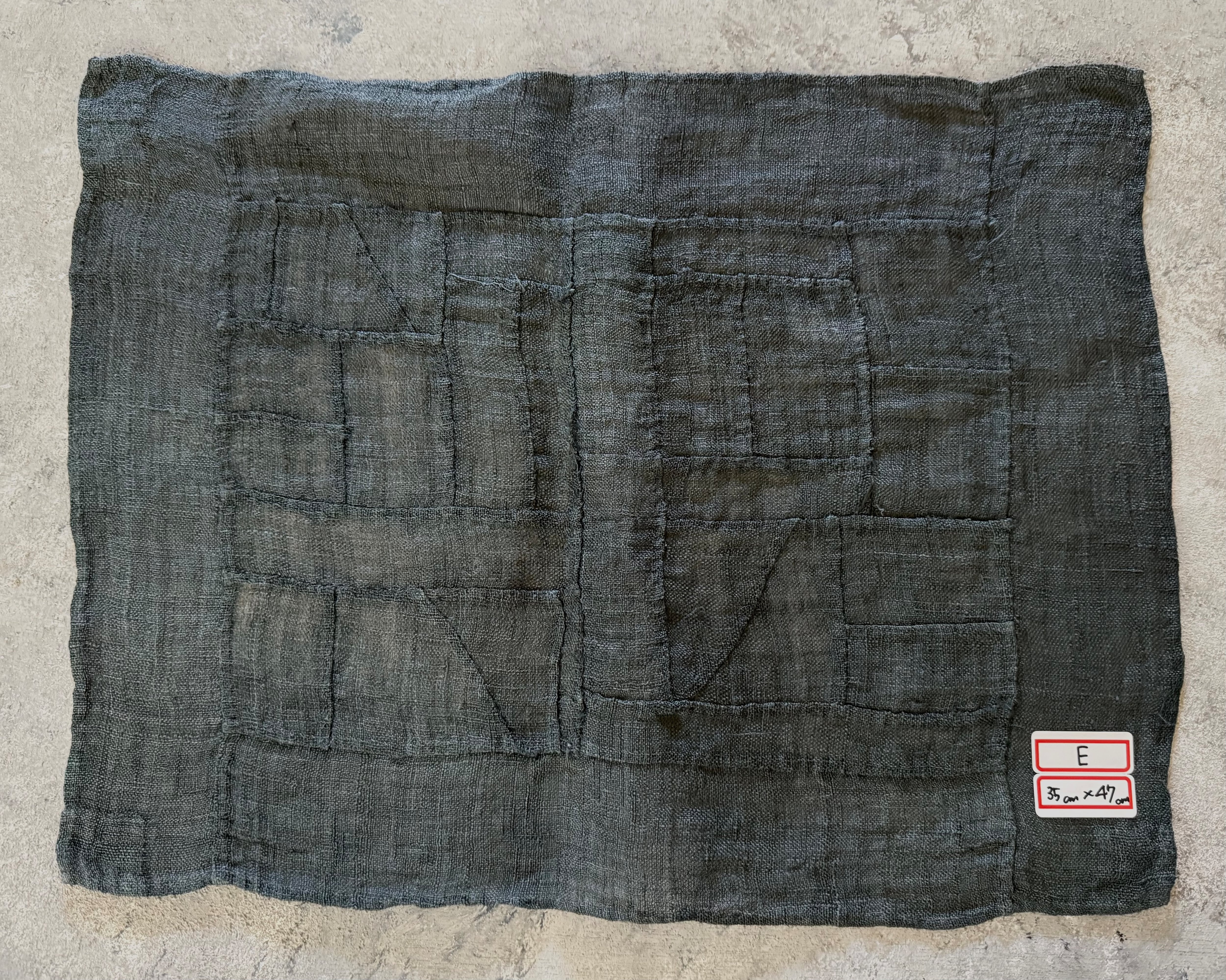 韓国の古い黒色の麻布を、丁寧につぎ合わせて作られた手縫いのポジャギ。