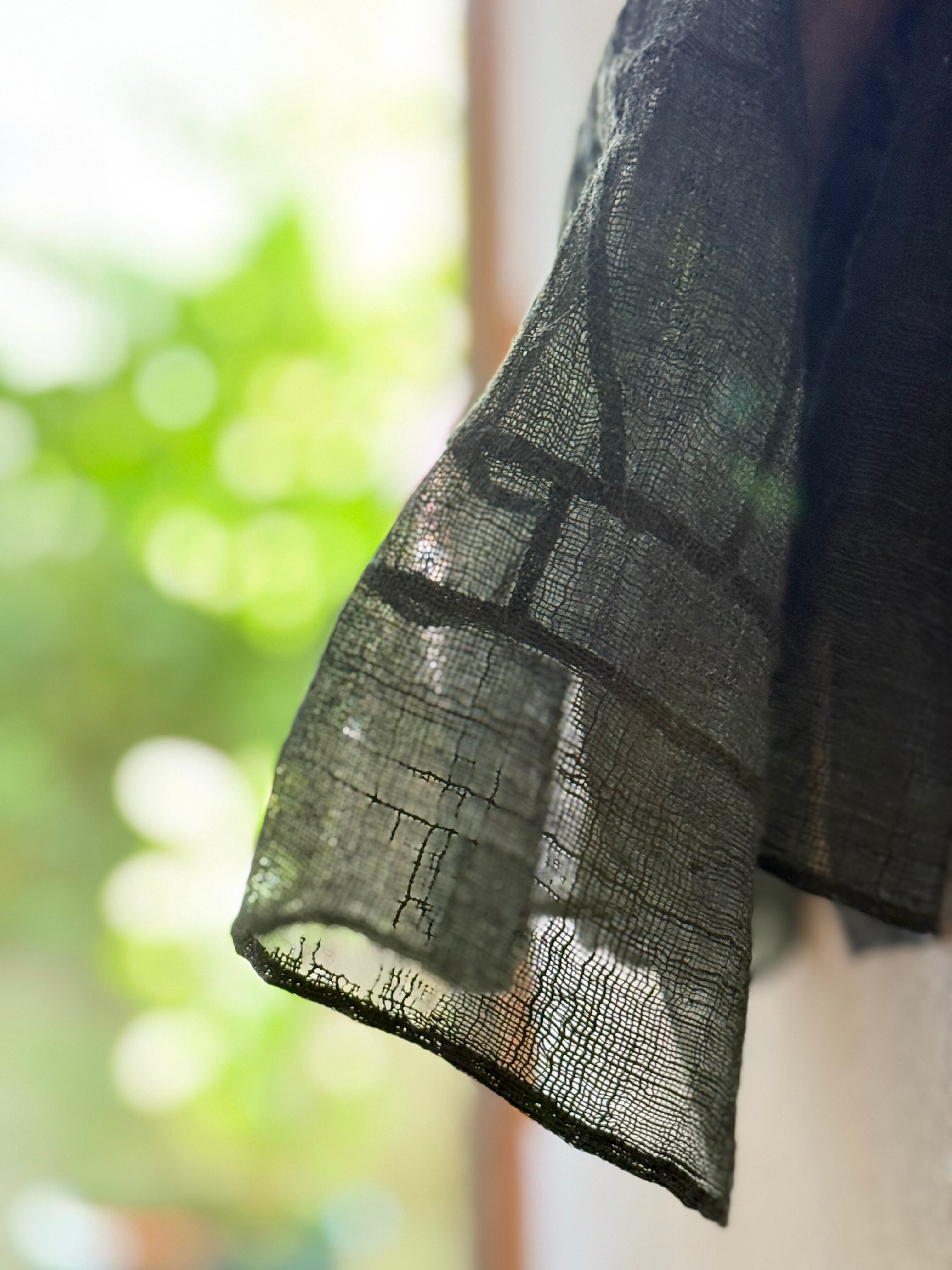 ゆらぎのあるステッチと、透け感のある素材が重なり合うことで、静かな美しさが生まれています。