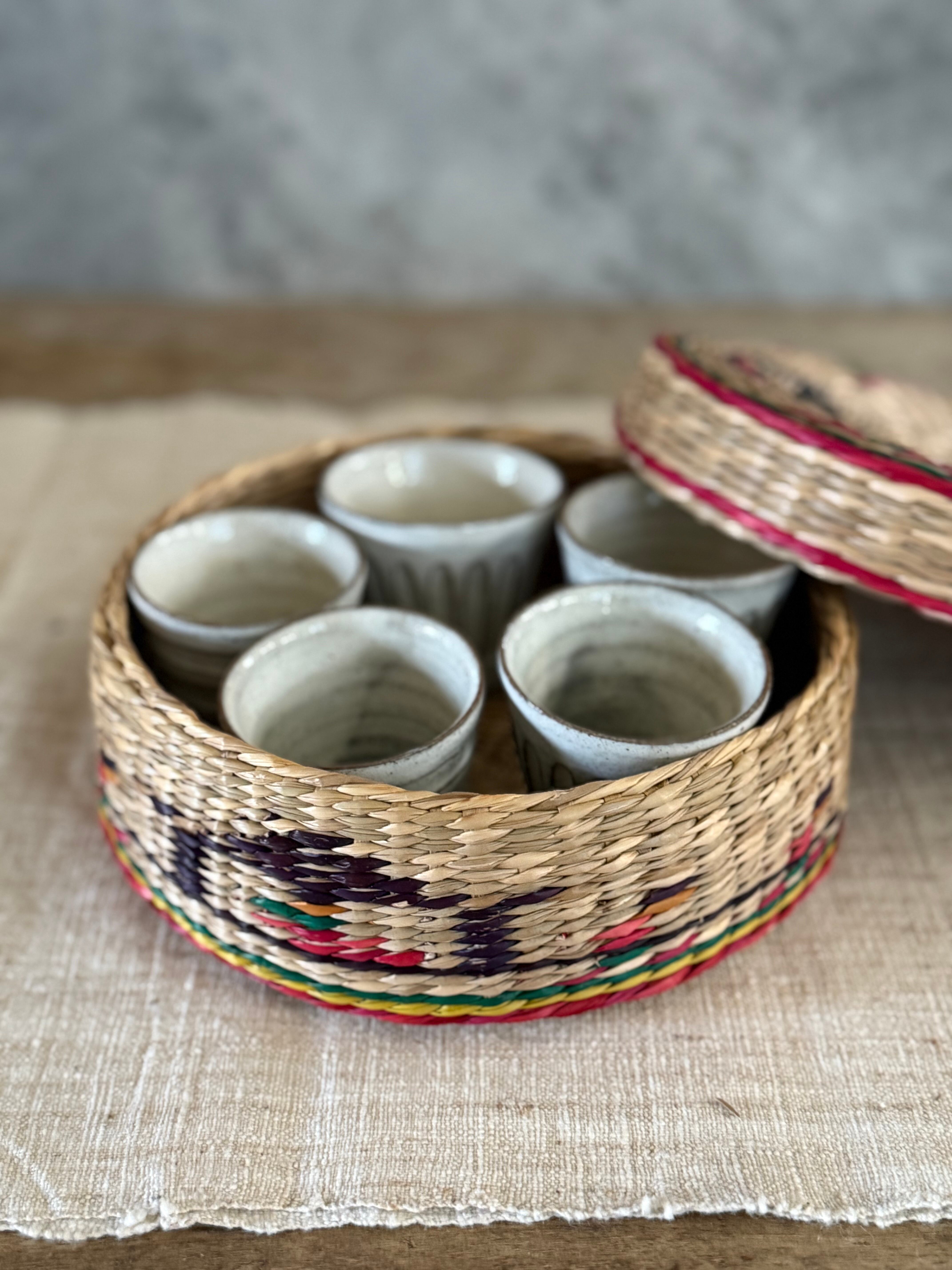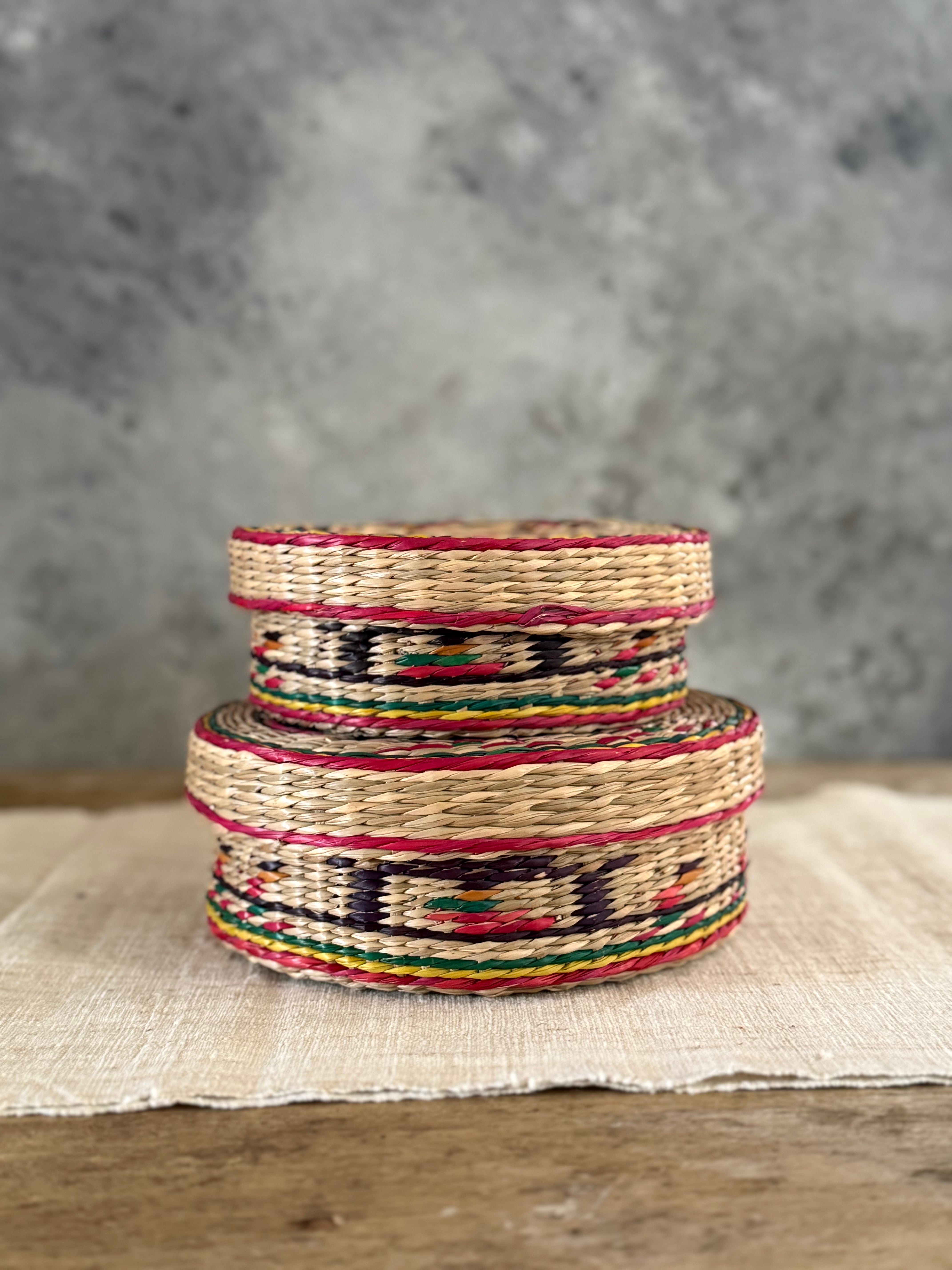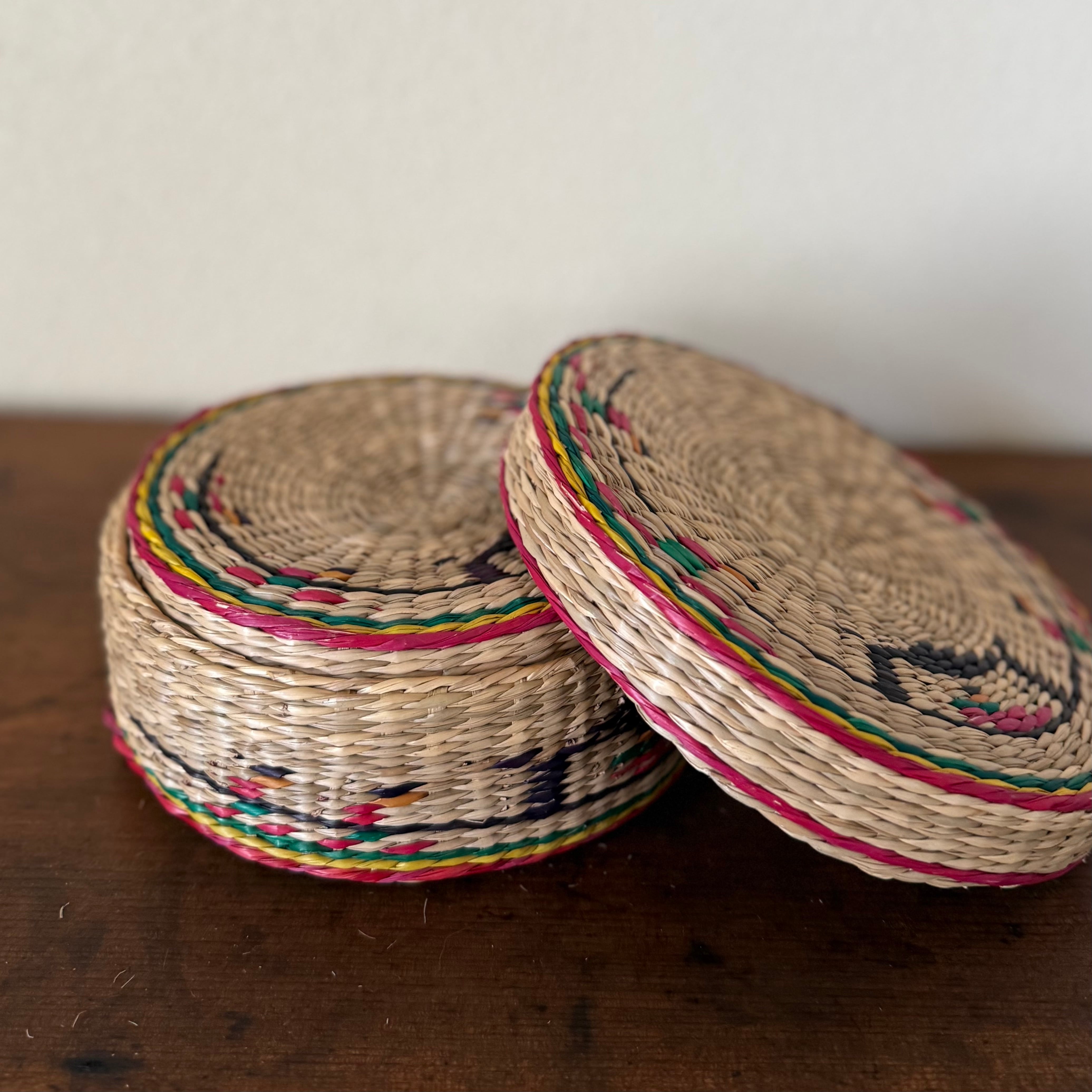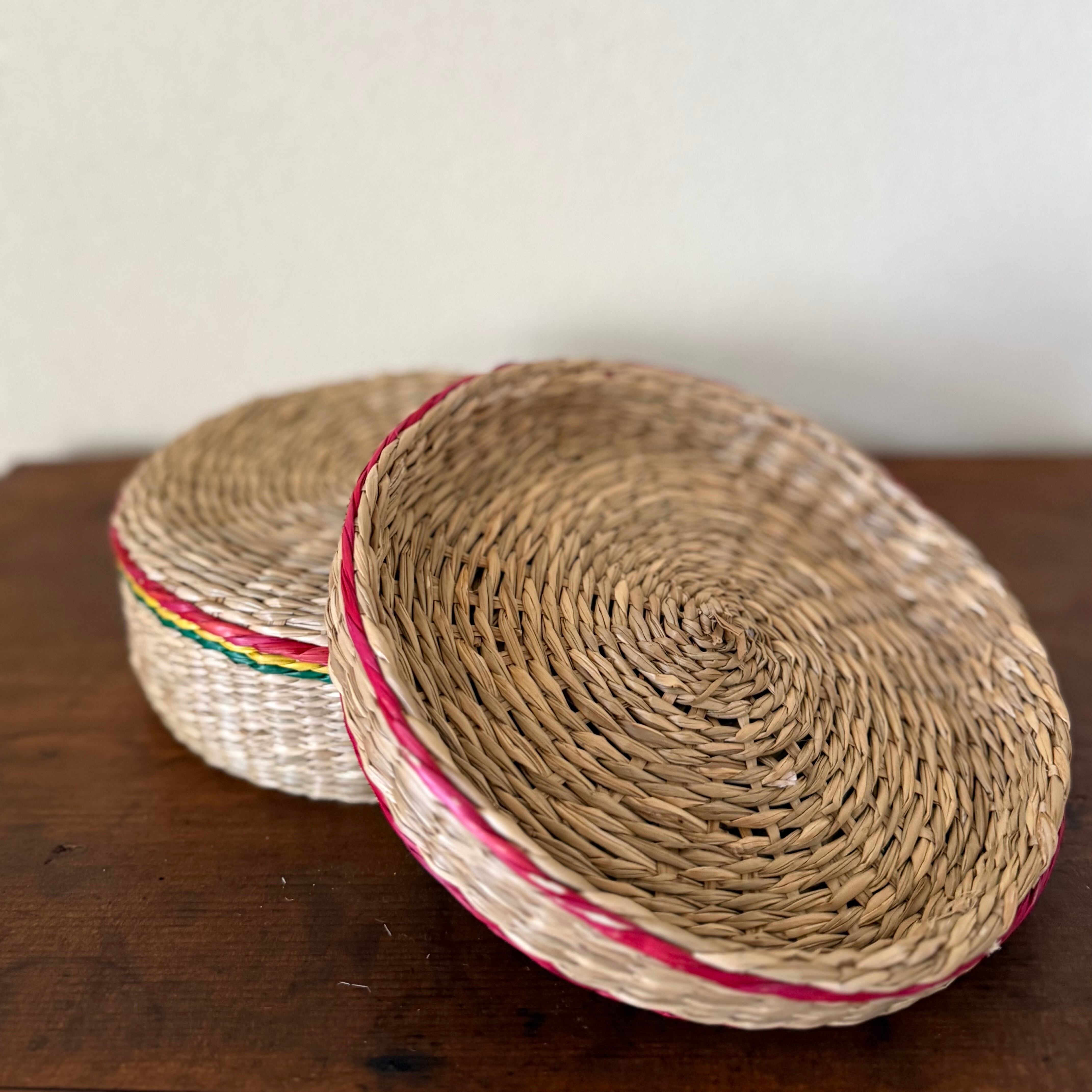 ワンゴルというい草のような自然素材に、赤・緑・黄・黒のビニール紐を編み込んだ、当時ならではの色使いが印象的。素朴で温かみのある佇まいに、どこか懐かしさを感じます。
