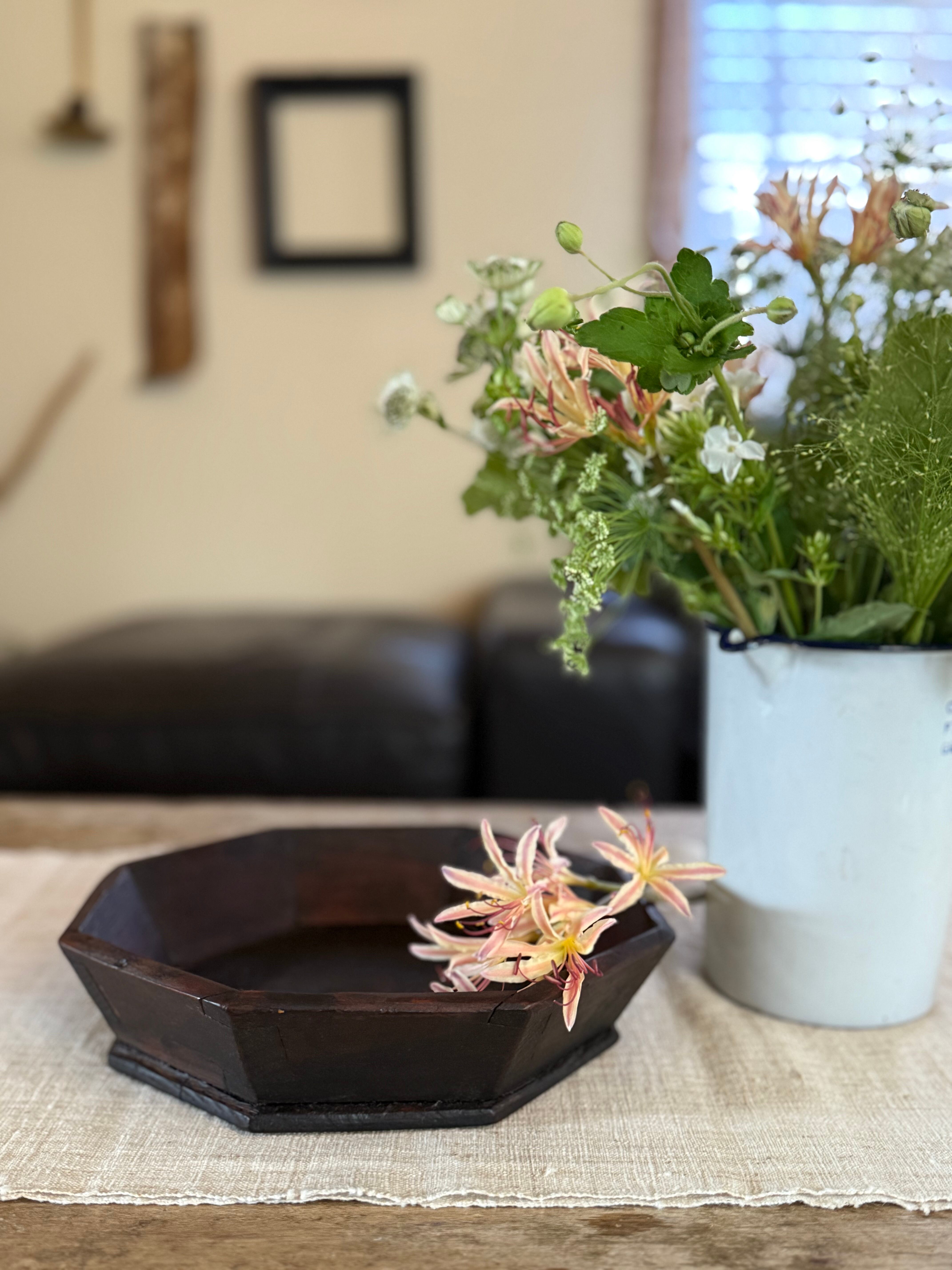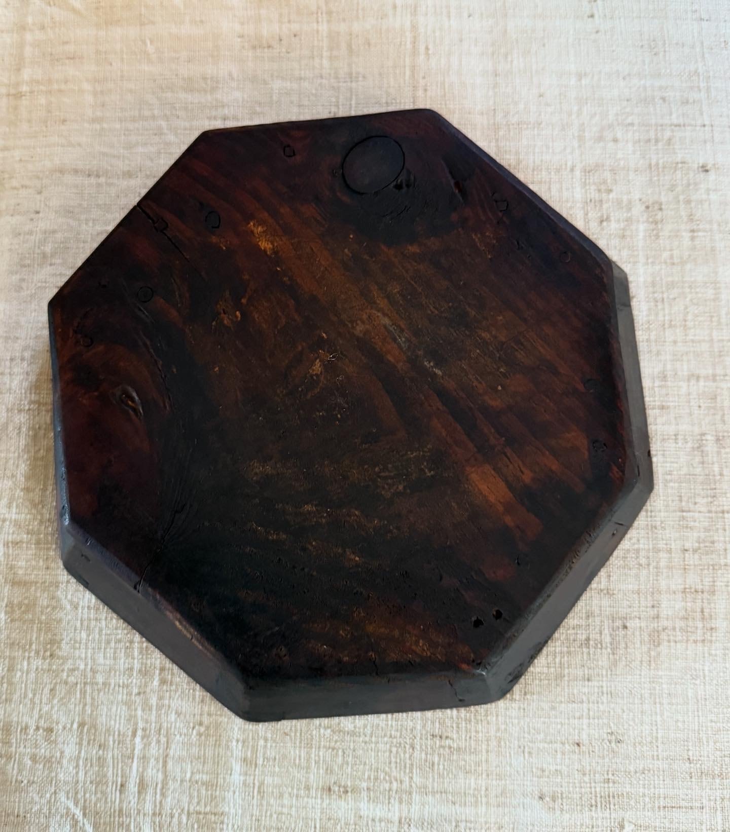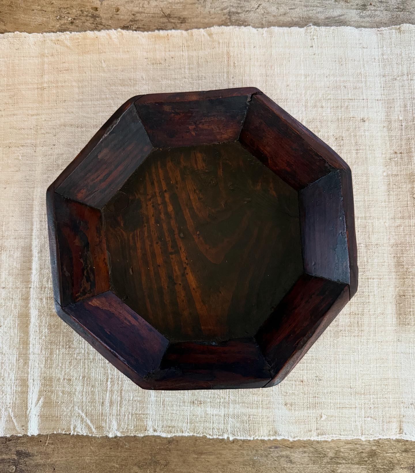 素朴な八角のかたちと、時を重ねた松材ならではの深い色合いが魅力です。